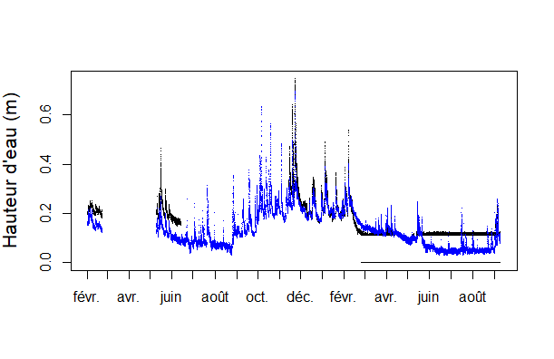 Données des niveaux limnimétriques enregistrés dans le réseau de piézomètre du site de restauration du Ruisseau du Cô-Malville, bassin versant du Ninian - Ploërmel (56). Débits minimums, optimaux et maximum calculés à partir de la courbe de tarage construite sur les différentes sections limnimétriques du site d'étude et des incertitudes qui lui sont associées.