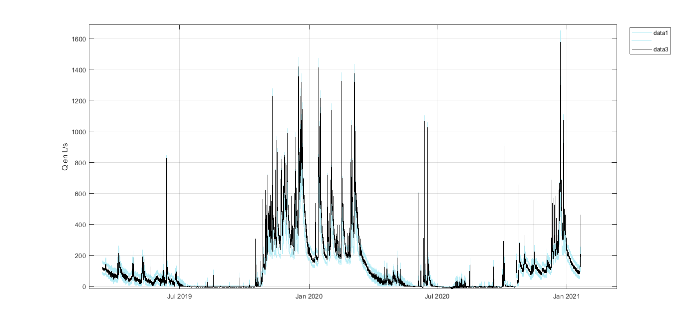 Données des niveaux limnimétriques enregistrés dans le réseau de piézomètre du site de restauration du Pas de l'Âne, bassin versant de la Flume à Vignoc (35). Débits minimums, optimaux et maximum calculés à partir de la courbe de tarage construite sur les différentes sections limnimétriques du site d'étude et des incertitudes qui lui sont associées.